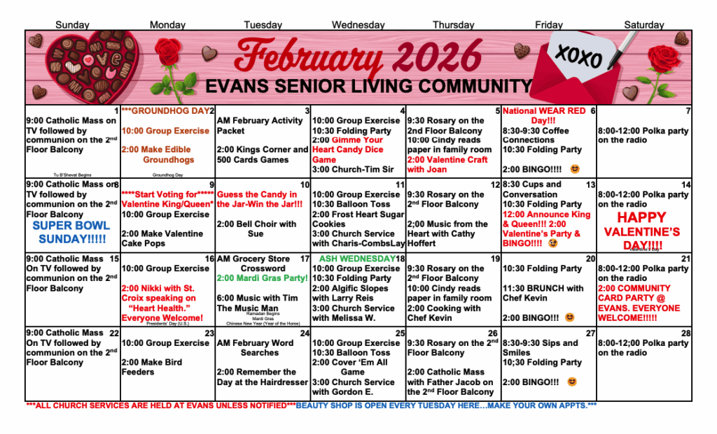 Evans Senior Living Community Activity Calendar- February 2026