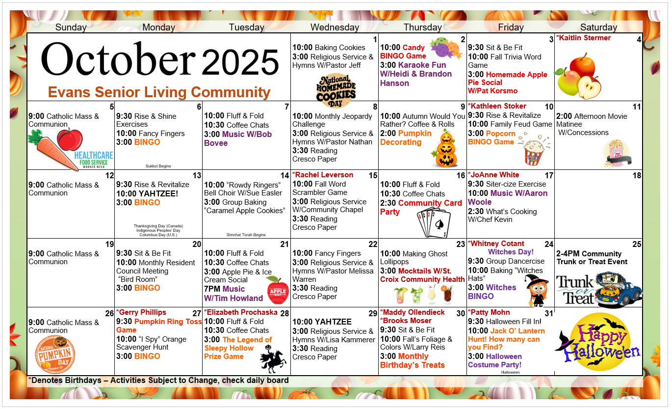 Evans Senior Living Community Activity Calendar